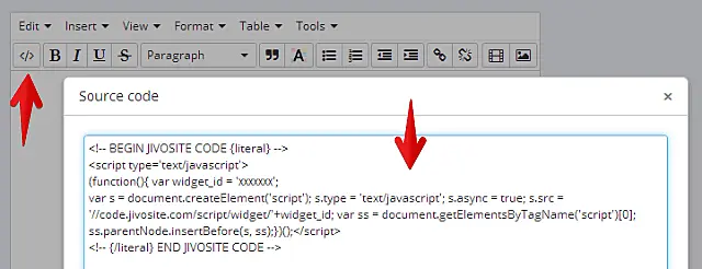 HTML -> Edit HTML source yolu ile aşağıdaki görselde gösterildiği üzere JivoChat kodunuzu yapıştırın.