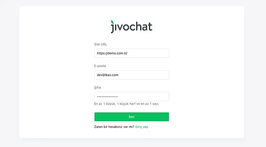 Eğer daha önce oluşturduğunuz bir JivoChat hesabınız yoksa direkt ikas üzerinden de JivoChat hesabınızı oluşturabilirsiniz.