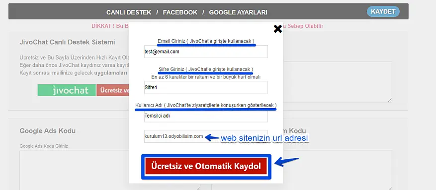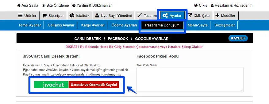 1. OdyoBilişim Yönetim panelinizde ayarlar > pazarlama dönüşüm alanına girin > Ücretsiz ve Otomatik Kaydol butonuna tıklayın.