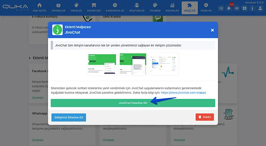 Qukasoft yönetim panelinde "Araçlar -> Eklentiler" ekranına girerek "JivoChat" eklentisine tıklayın.