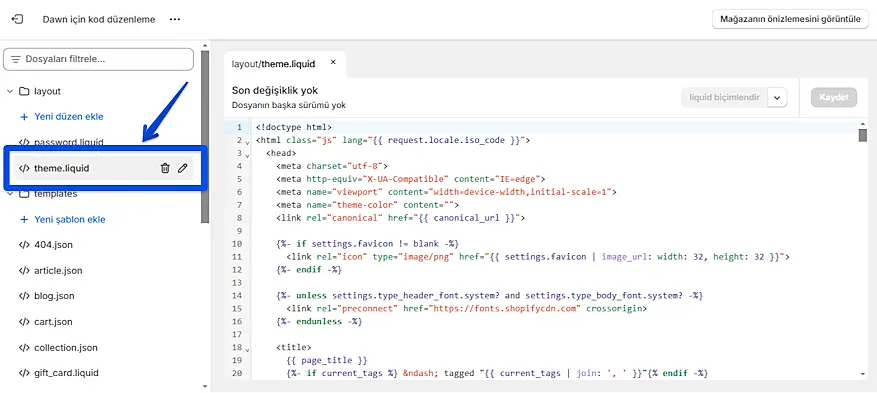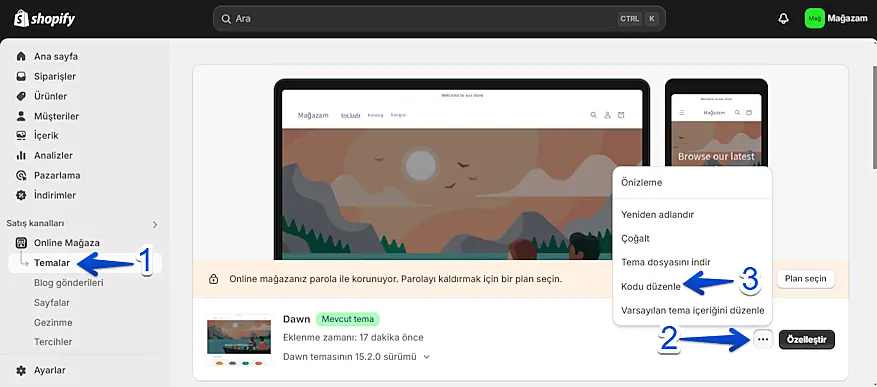 Shopify kontrol panelinize gidin -> "Satış Kanalları" -> Online Mağaza bölümünde "Temalar‘a tıklayın -> Ardından ’Özelleştir" düğmesinin yanındaki üç noktaya tıklayın -> Son olarak "Kodu düzenle "ye tıklayın.