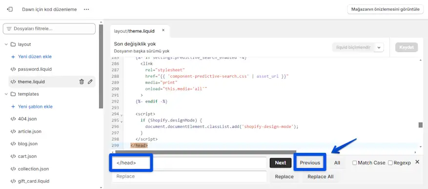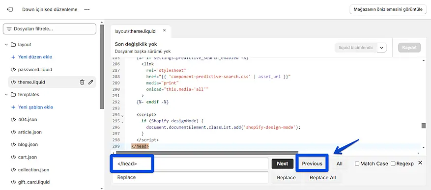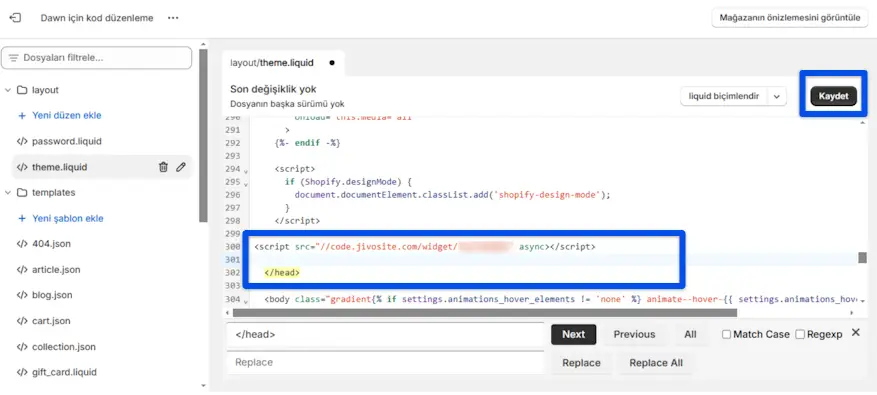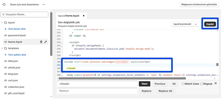 Kopyalamış olduğunuz JivoChat kurulum kodunu kapanış head etiketinin önüne yapıştırın -> Ardından Kaydet'e tıklayın.