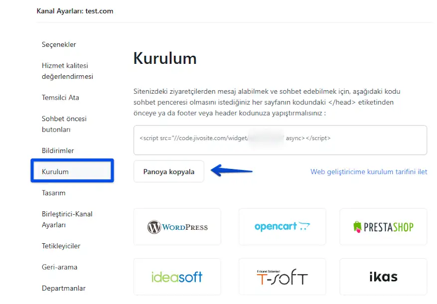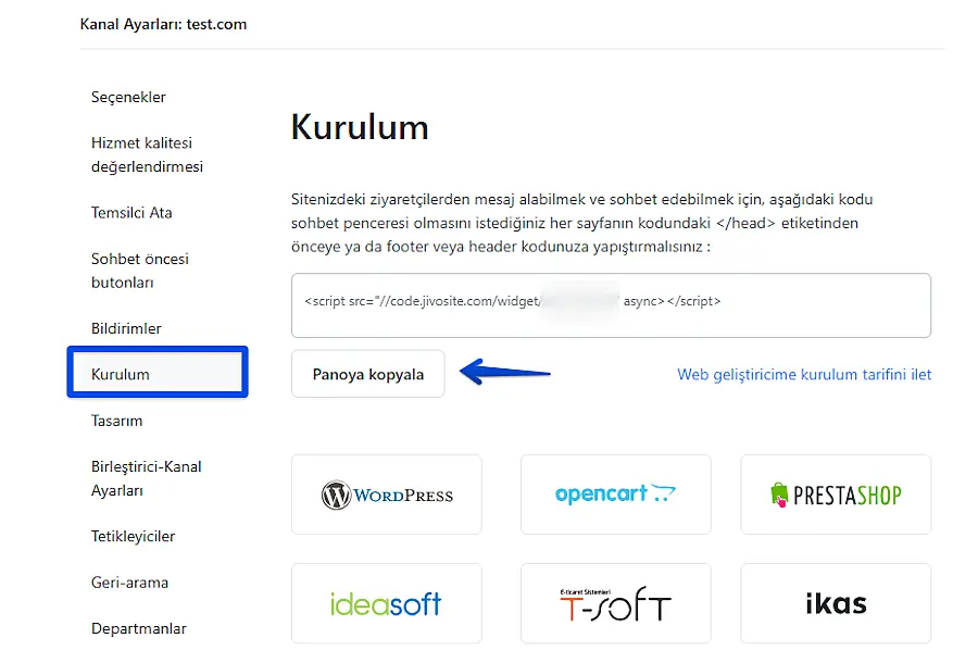 Kurulum kodunuzu JivoChat hesabınızdan "Yönet" -> "Kanallar" -> "Kanal ayarları" -> "Kurulum" -> "Panoya kopyala" seçeneğine giderek kopyalayın.
