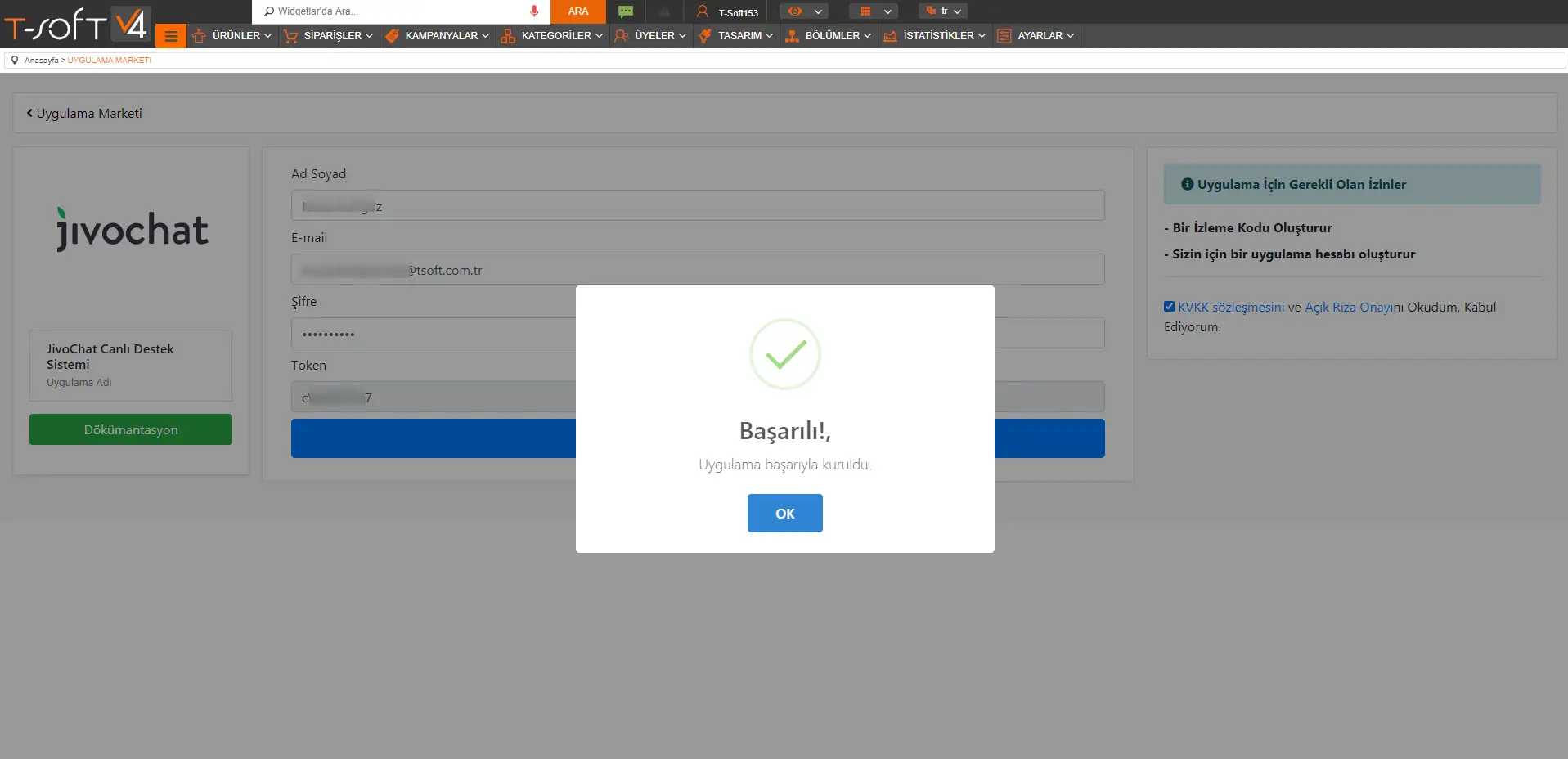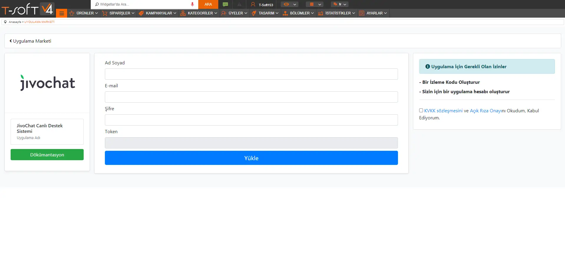 T-Soft E-Ticaret sitenizin yönetim panelinde --> Bölümler --> Uygulama Marketi --> Tüm Uygulamalar sayfasına geliniz ve JivoChat uygulamasını seçerek 'Yükle' butonuna tıklayınız.