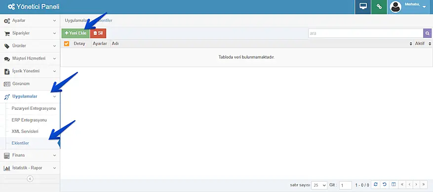 Yönetim paneline giriş yaptıktan sonra sol menüden Uygulamalar > Eklentiler bölümüne gelin > Yeni Ekle butonuna tıklayın.