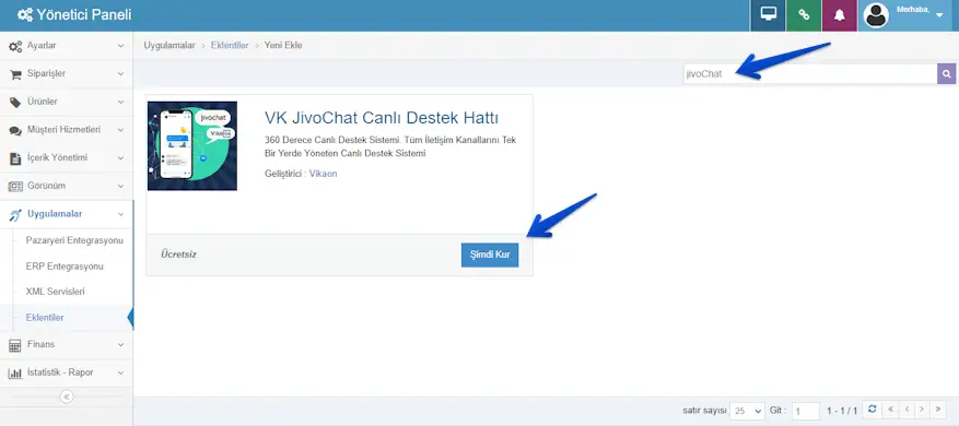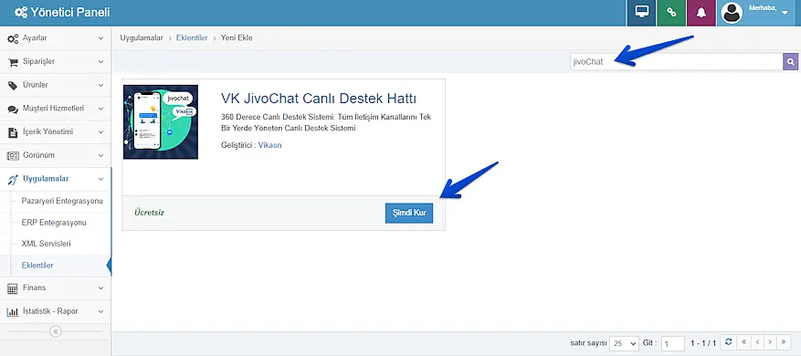 Sağ üst kısımda yer alan arama çubuğundan JivoChat'i aratıp > Şimdi Kur butonuna tıklayın.