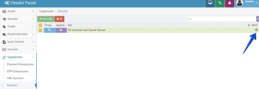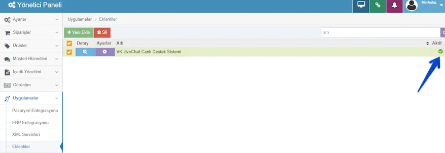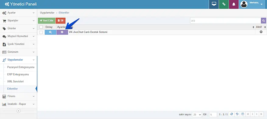 Ekranda İşlem Tamamlandı uyarısını gördükten sonra soldaki menüden Eklentiler bölümüne geri dönün ve VK JivoChat Canlı Destek Sitemi satırındaki ayarlar simgesine tıklayın.