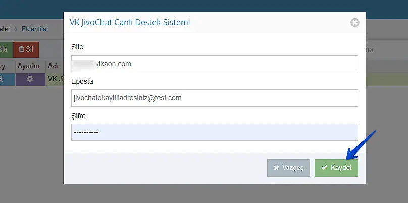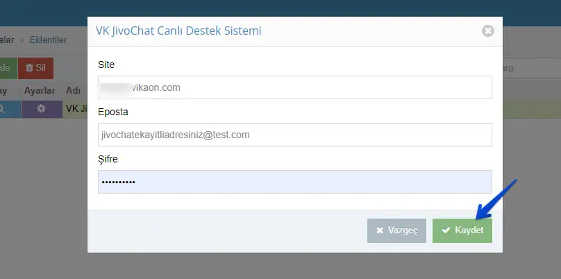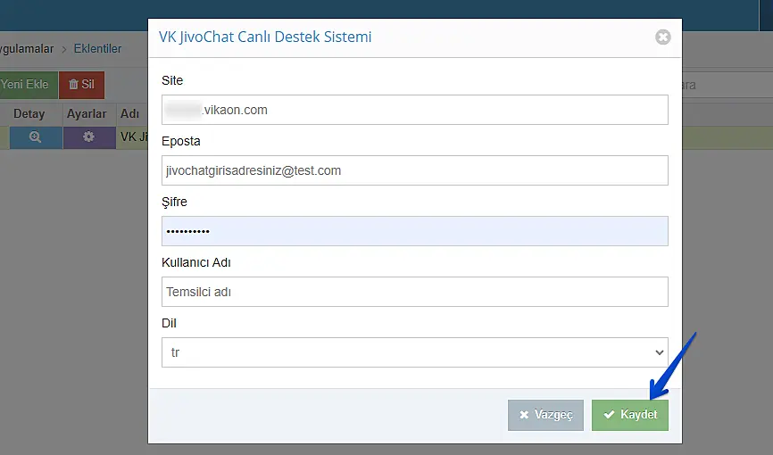 Halihazırda bir JivoChat hesabınız var ise Zaten hesabım var butonuna tıklayarak mevcut hesap bilgilerinizi girerek Kaydet butonuna tıklayabilirsiniz.