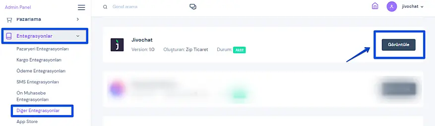 Sol işlem menüsünden sırasıyla Entegrasyonlar > Diğer Entegrasyonlar adımlarını takip edin. Karşınıza çıkan sayfadan Jivochat'i bulun ve Görüntüle tuşuna tıklayın.