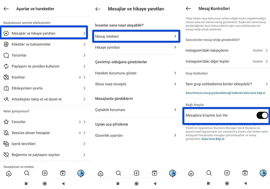 İlk olarak, Instagram uygulamanızda "Mesajlara Erişime İzin Ver" seçeneğini etkinleştirin ("Ayarlar" > "Mesajlar ve hikaye yanıtları" > "Mesaj istekleri").