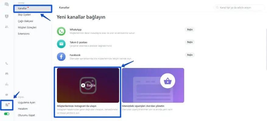 Şimdi JivoChat uygulamasını açın ve Yönet > Kanallar yolunu izleyin:
