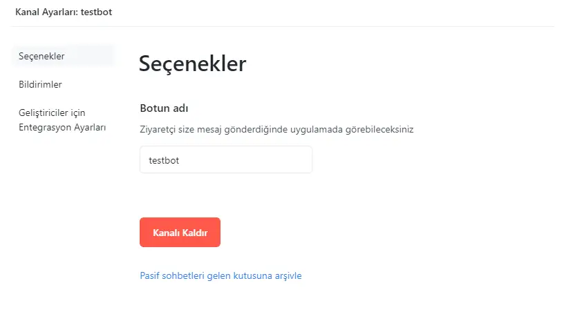 Bot için bir ad girin. Seçtiğiniz ad, müşterileriniz botunuzla sohbet ettiklerinde görecekleri ad olacaktır. Örneğin, "Test".