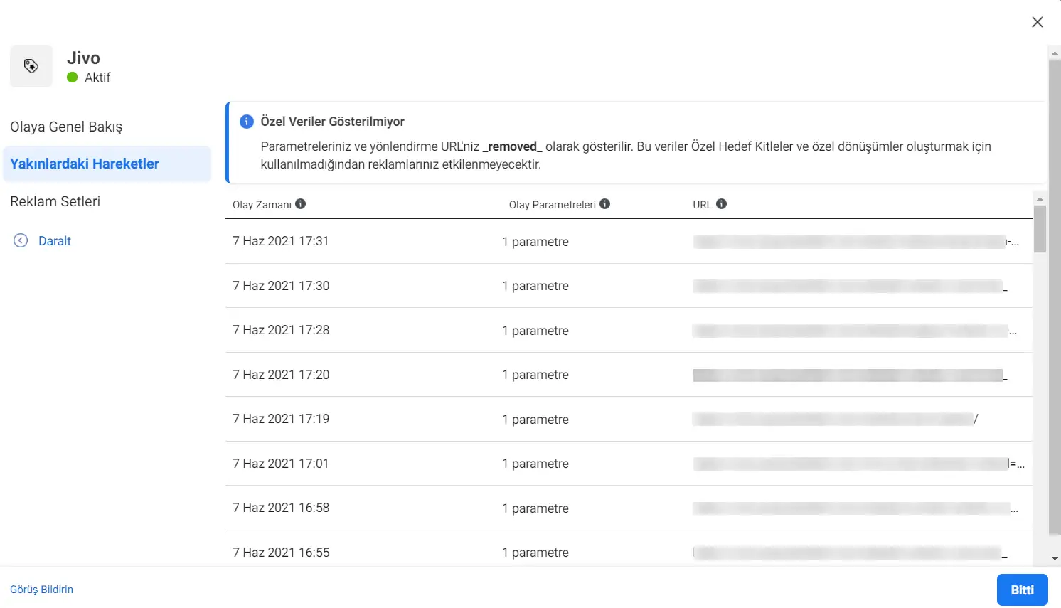 Facebook Pixel'de bulunan etkinliklerin tanımı