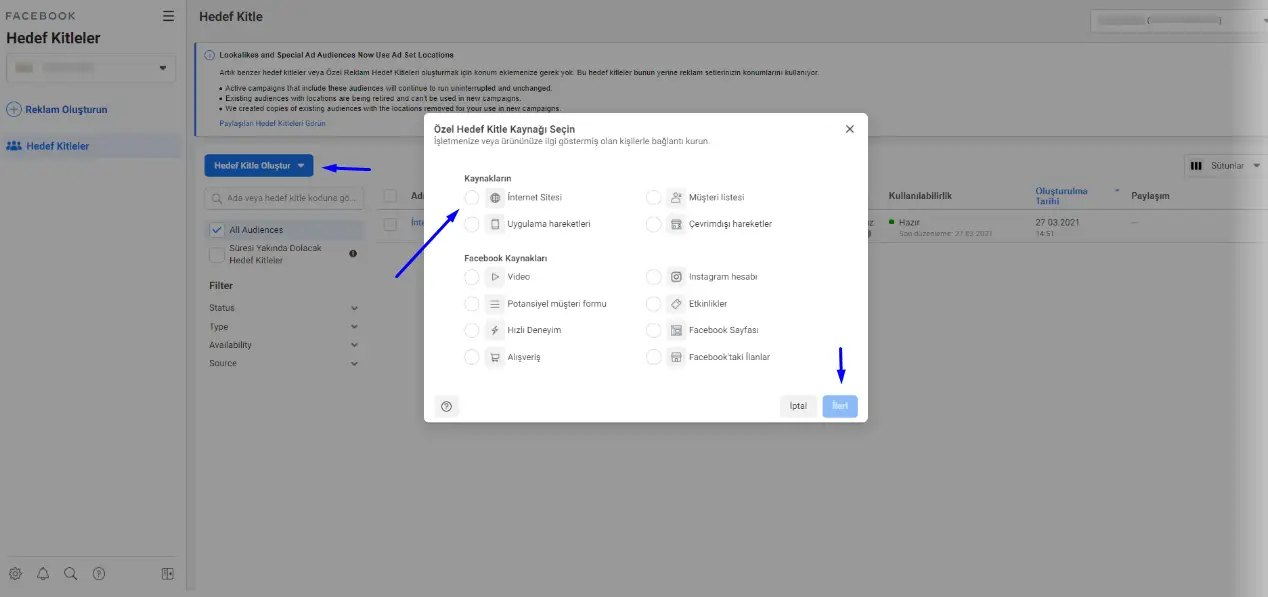 2."Özel Hedef Kitle Oluştur"a tıklayın ve kaynak olarak "Web Sitesi"ni seçin: