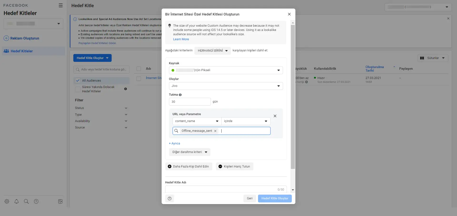3.JivoChat'dan bir (veya daha fazla) etkinlik kullanarak aşağıdaki resimde gösterildiği gibi yeni bir özel hedef kitle oluşturun: