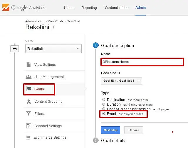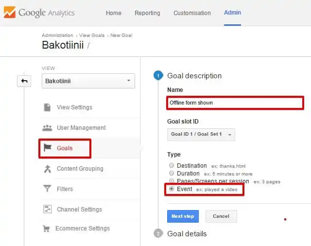 Hedefin adını girin (örneğin, "JivoChat çevrimdışı mesaj") ve tür olarak "Etkinlik" seçeneğini seçin.