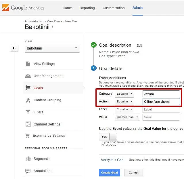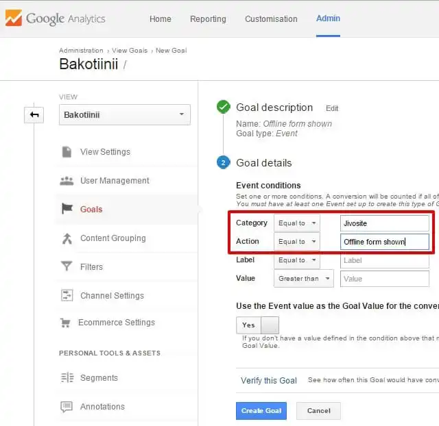 b. Action = Google Analytics'te iletilen JivoSite olaylarından biri (bu örnekte, "Çevrimdışı mesaj gönderildi"). Mevcut etkinliklerin tam listesi yukarıda verilmiştir. İngilizce versiyonlarını girmelisiniz.