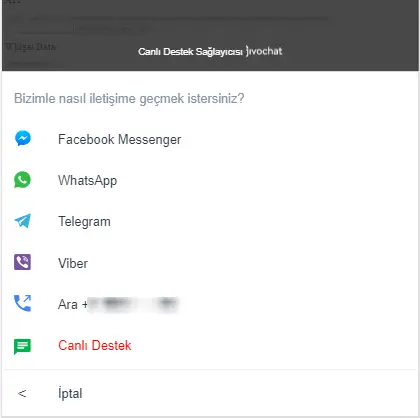 Sohbet aracının masaüstü versiyonu biraz farklı bir görünüme sahiptir: Ziyaretçiler imleci sohbet butonunun üzerine getirdiklerinde, eğer daha önceden bağlantı yapıldıysa canlı desteğe ek olarak Facebook Messenger ve Geri-arama etiketlerini seçebilecekler. Ziyaretçiler Facebook etiketine tıklayarak sohbete Facebook Messengerdan da devam edebilecekler. Böylece siteden ayrılsalar da iletişimde kalabilecekler.