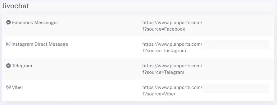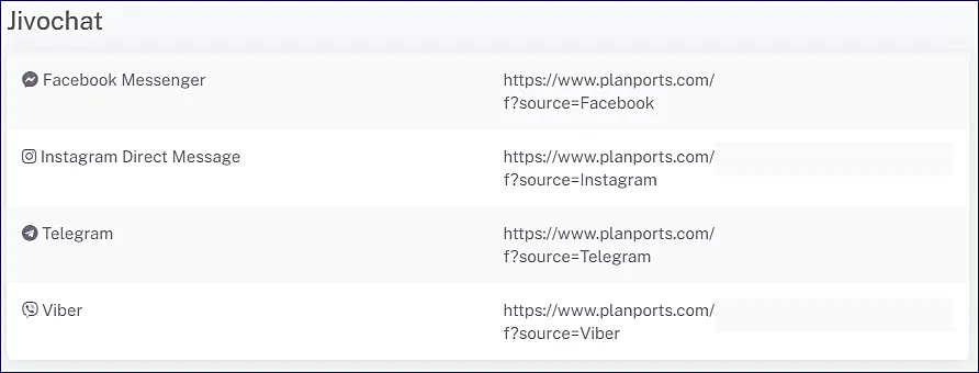 Başla butonuna bastıktan sonra Jivochat de oluşturulmuş her bir kanal türü için ayrı ayrı oluşturulmuş webhook adreslerine erişeceksiniz. Bağlamak istediğiniz kanal türü için webhook adresini kopyalayın.
