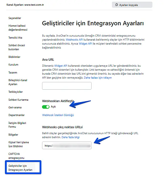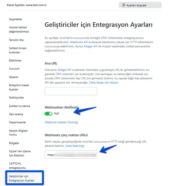 Ardından, "Geliştiriciler için Entegrasyon Ayarları" menüsüne girin, "Webhookları Etkinleştir" seçeneğini etkinleştirin ve Planports CRM’den kopyaladığınız Webhook URL’nizi "Webhooks çıkış notkası URLsi" alanına ekleyin.