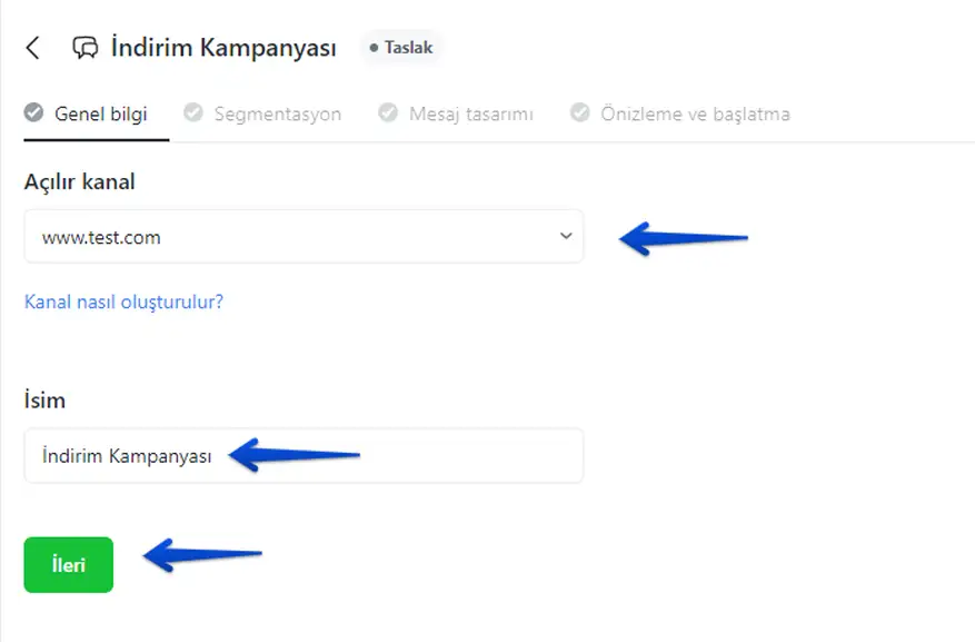 - Kampanyanız için dilediğiniz websitesi kanalınızı seçin (bu özellik şimdilik yalnızca bu kanal türü için kullanılabilir)