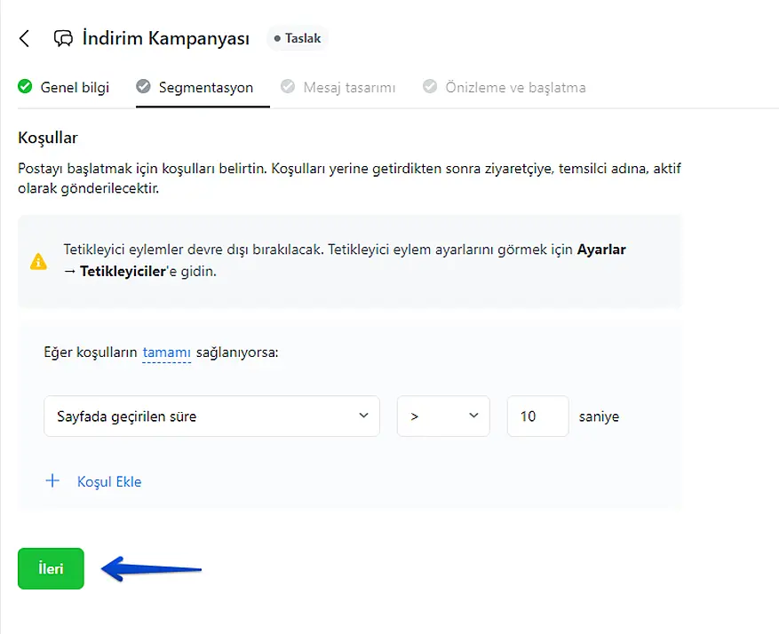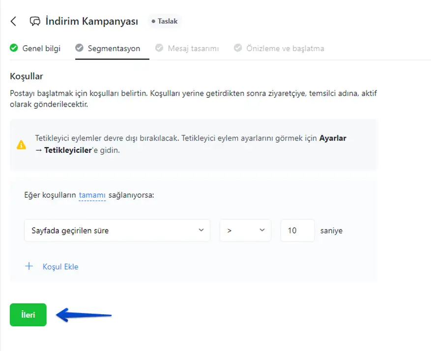 Şimdi segmentasyon menüsünü göreceksiniz. Bu menüde müşterilerinizi segmentlere ayırabilirsiniz. Tetikleyicilerde olduğu gibi koşulları kullanın, ülke başına, web sitesinde ve sayfada geçirilen süreye ve daha pek çok şeye göre segmente edebileceğinizi unutmayın.