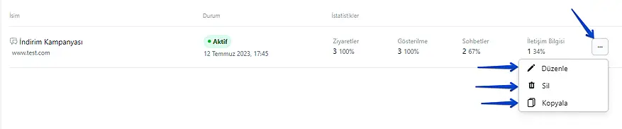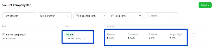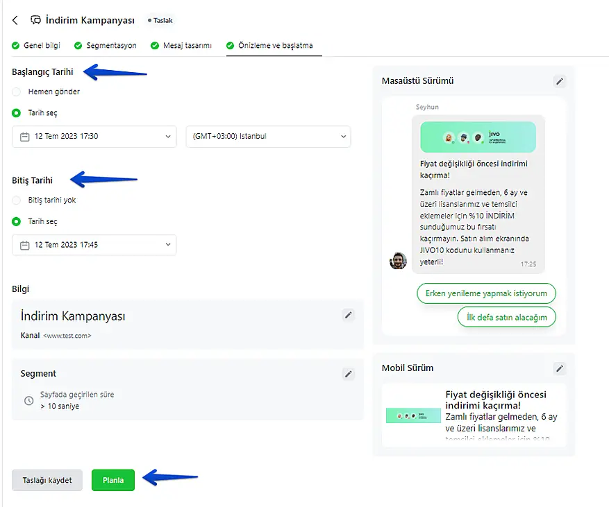 Pazarlama kampanyaları ile web siteniz için açılır davetinize bir zaman belirleyebilecek, bir resim, metin ve sohbet öncesi butonları ekleyebileceksiniz.