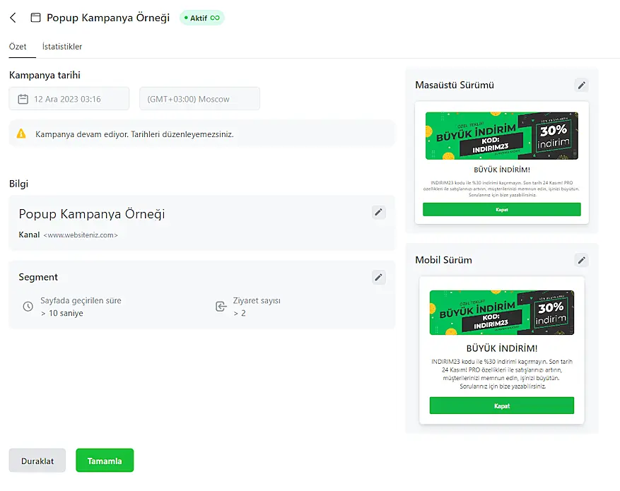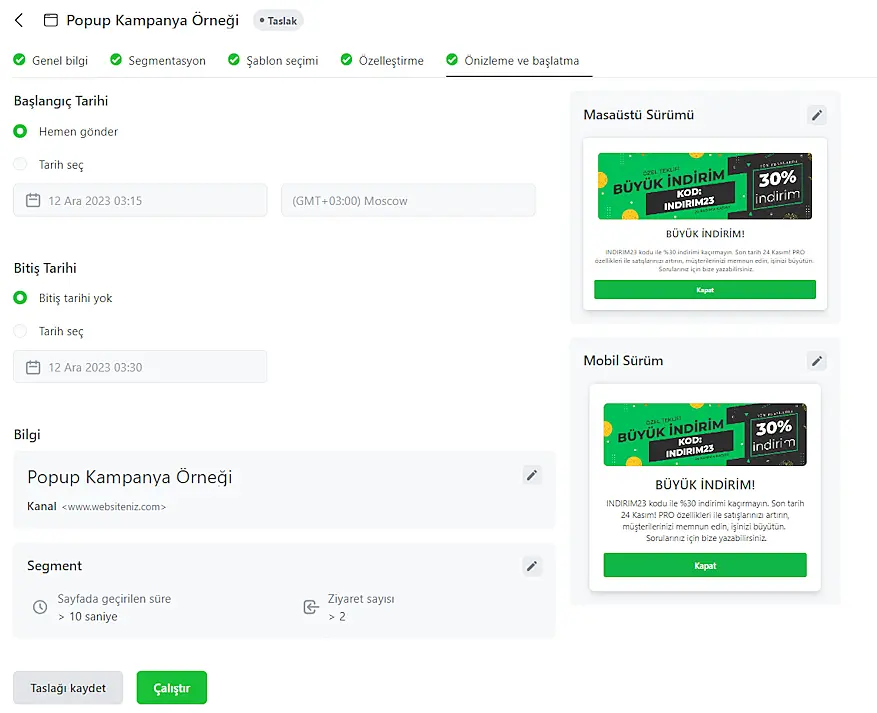 Başlatmadan önce pencerenin ne zaman başlatılacağını belirleyin: hemen şimdi veya belirli bir tarih ve saatte. Kampanya için bir bitiş tarihi seçin veya kalıcı hale getirin. Kampanya hazır!
