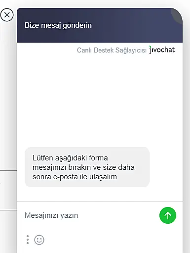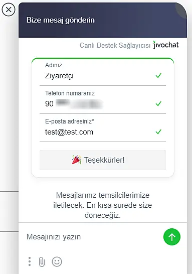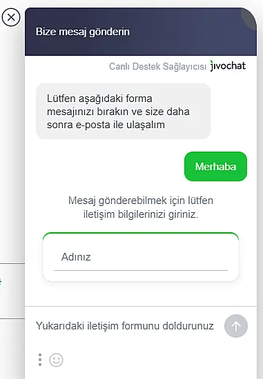 Herhangi bir sorunuz olursa, bilgi@jivochat.com.tr adresinden veya direkt olarak sitemizdeki canlı destek aracılığıyla bizimle iletişime geçmekten çekinmeyin.