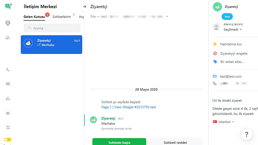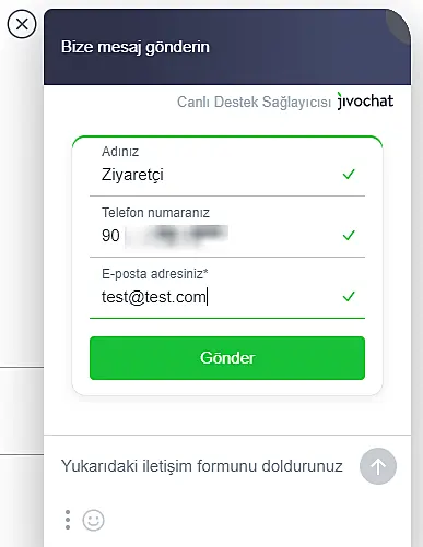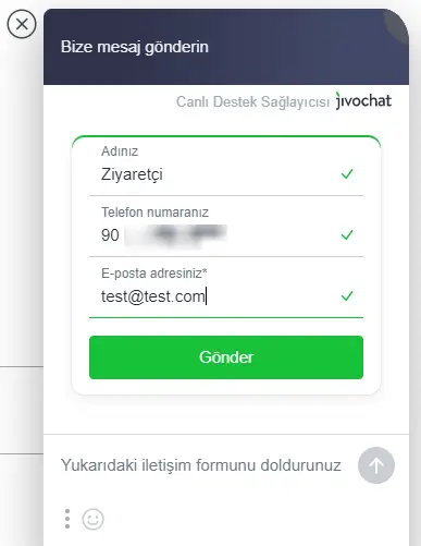 Ziyaretçiler bir mesaj yazdıktan sonra, mesajı ekibinize göndermek için bazı iletişim bilgilerini bırakma talebi alırlar. Bu, müşterilerinizin isteklerini cevaplamak üzere e-posta veya telefon yoluyla iletişime geçebilmeniz için gerekli ve önemlidir.
