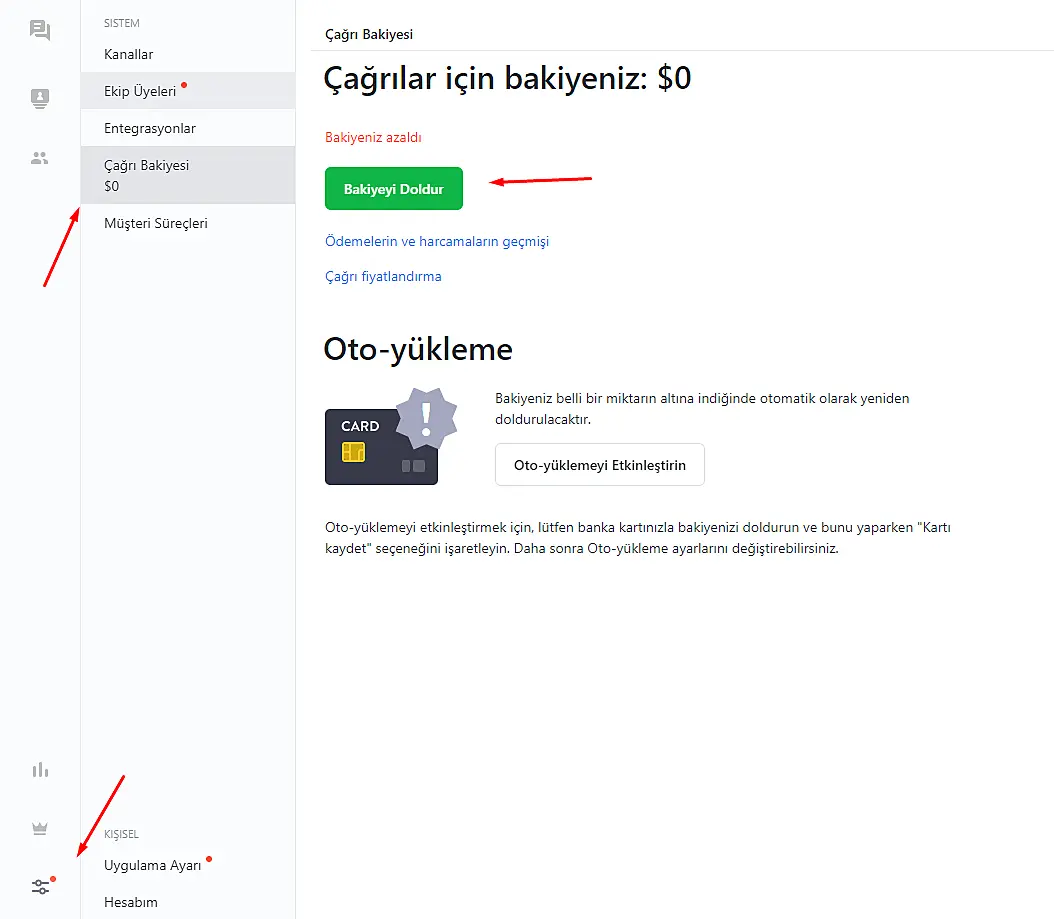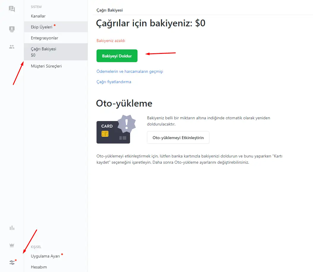Geri-arama özelliğini aktifleştirdiyseniz ve bakiye yüklemek istiyorsanız JivoChat masaüstü uygulaması veya Jivochat web uygulamasına gidin ve Ayarlar=> Çağrı Bakiyesi=> Bakiye Doldur seçeneğini tıklayın.