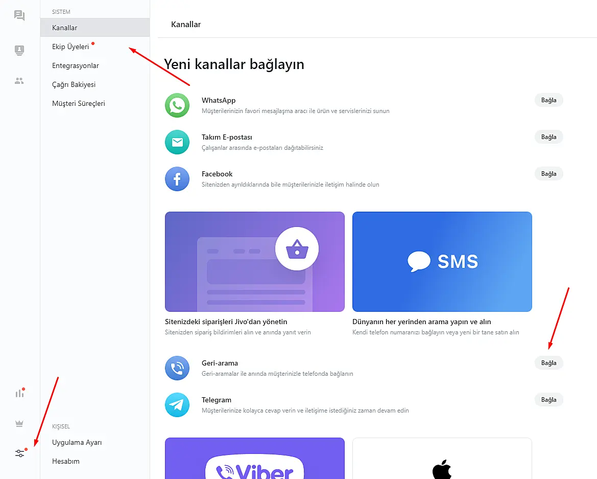 Geri arama özelliğini etkinleştirmek için, JivoChat web uygulamanıza veya Masaüstü uygulamanıza erişin ve Yönet => Kanallar => Yeni Kanal Ekle => Geri Arama yolunu izleyin: