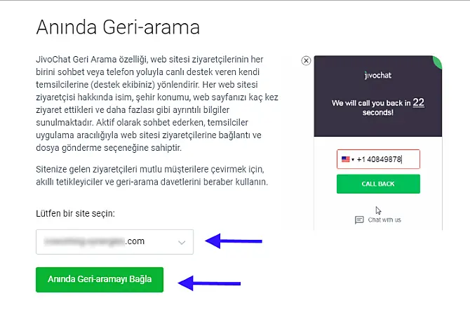 Özelliği etkinleştirmek istediğiniz web sitesini seçin ve "Anında Geri-aramayı Bağla" düğmesine tıklayın: