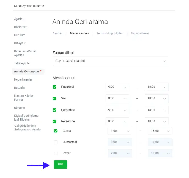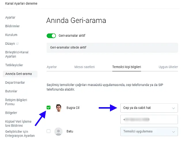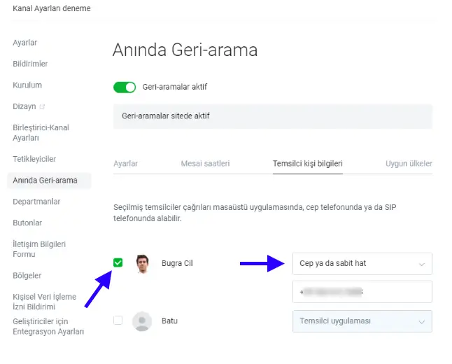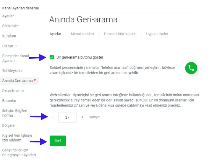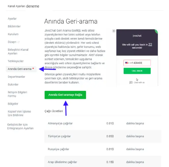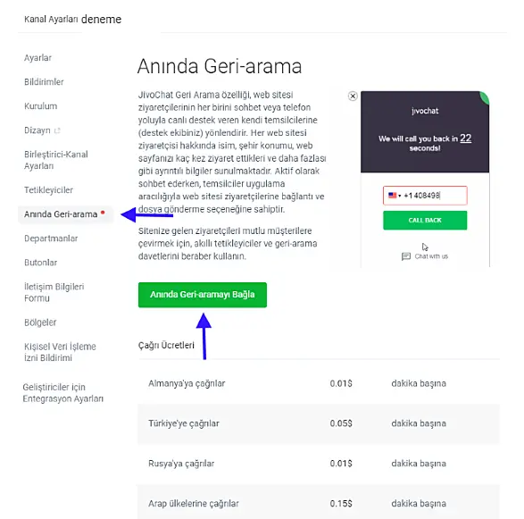 Soldaki menüden "Anında Geri-arama" seçeneğine girin ve "Anında Geri-aramayı Bağla" düğmesine tıklayın: