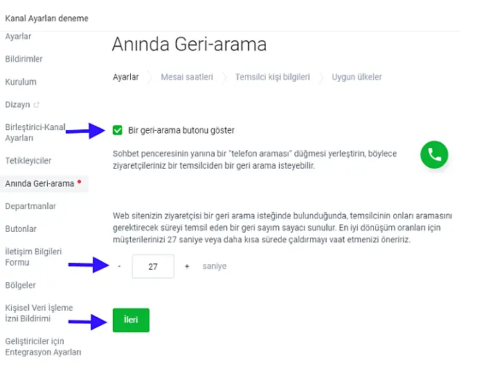• Bir geri-arama butonu göster: Web sitenizdeki Geri-aramalar için ayrı bir düğme istiyorsanız bu kutuyu işaretleyin.