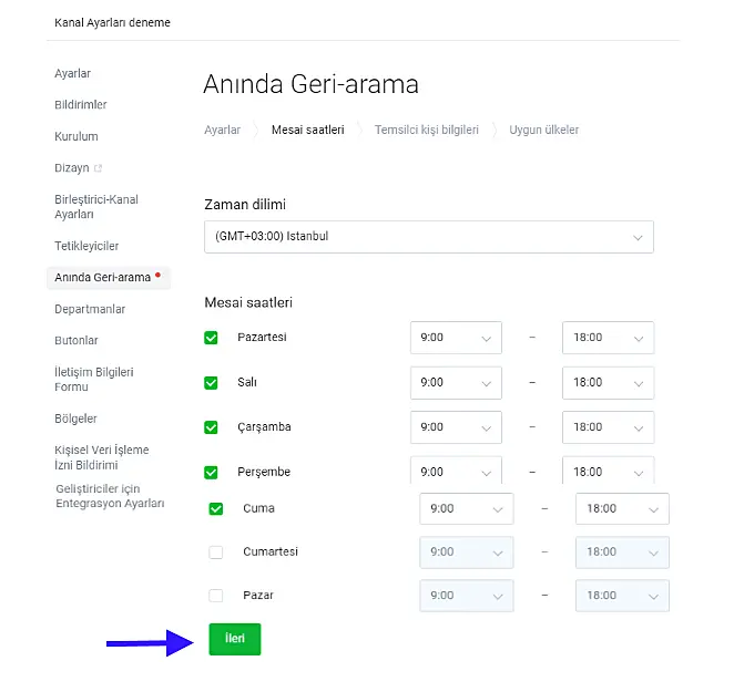 İleri tuşuna basın ve sohbet kutusunda geri-aramaların kullanılabilir olacağı gün ve saatleri seçin.