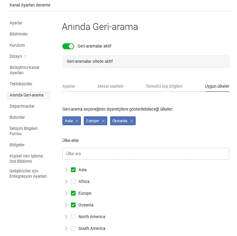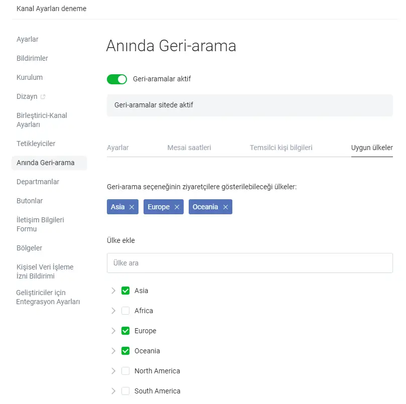 Geri-arama özelliğinin ziyaretçilere gösterilebileceği ülke/kıta seçimlerini yapın.