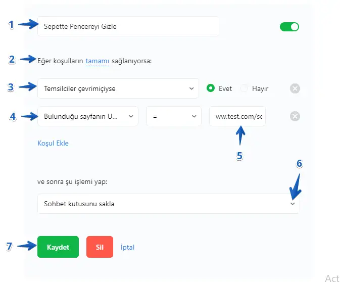 "İçeriyorsa" seçeneğini seçin ve sohbet penceresinin gözükmesini istemediğiniz sayfaların üst küme URL parçasını ekleyin (örn. siteniz.com/satinalma) veya "=" seçeneğini seçin ve gözükmesini istemediğiniz sayfanın tam URLsini girin. Sohbet penceresini gizlemek için birden fazla sayfanız varsa, lütfen her sayfa için birden fazla eylem eklemeniz gerektiğini unutmayın.