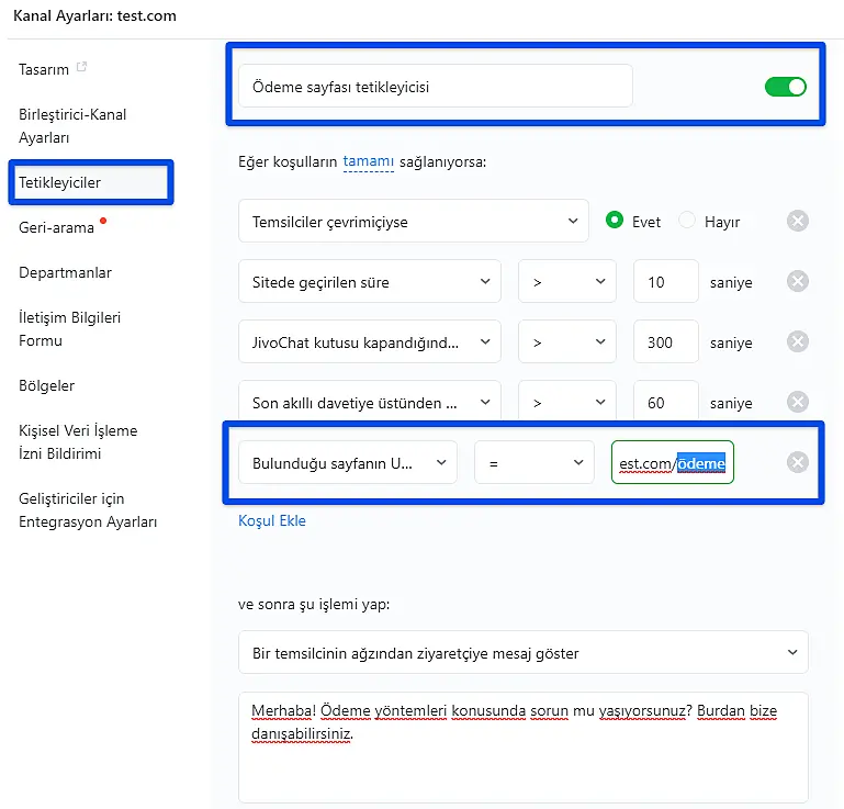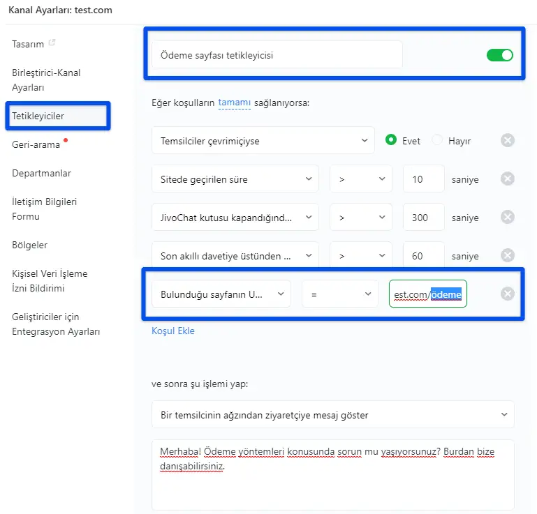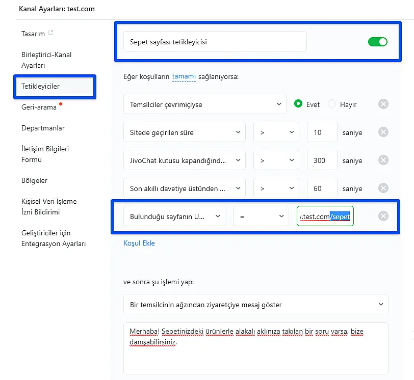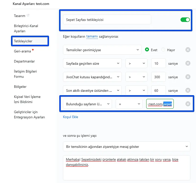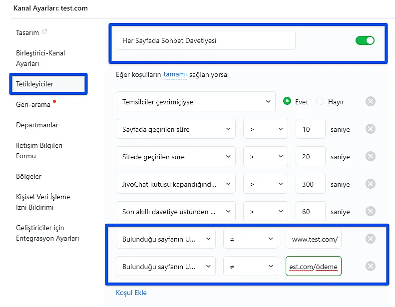 Farklı sayfalar için farklı metinler içeren akıllı davetiyeler kurarsanız çok faydalı olabilir. Bunları ayarlamak için JivoChat uygulamasını açın -> Yönet -> Kanallar -> Site adı altındaki Ayarlar -> Tetikleyicilere gitmeniz gerekecek.