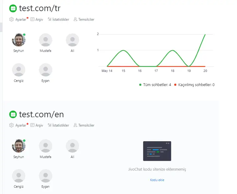 Web sitenizin ayrı bölümlerinde bulunan farklı alt alanlar veya dizinleriniz varsa (örneğin: forumlar, bloglar), 'Kanal Ekleyin' düğmesi aracılığıyla bu tür parçalar için ek sohbet kutuları oluşturabilirsiniz. Ayrıca, alt alanlar veya dizinler için eklediğiniz bu yeni kanalların kodlarını ilgili dizine gömmeniz ve her kanal için Tetikleyici kurallarını ayrı ayrı ayarlamanız gerekir. Yani aynı sitenin farklı bölümlerine, farklı siteler gibi davranmalısınız.