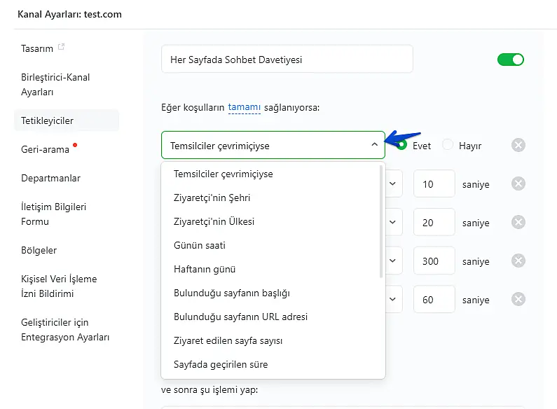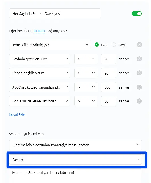 İlk şart zorunludur: "Temsilciler çevrimiçiyse" - "Evet". Sohbet penceresinin çevrimiçi ve çevrimdışı modlarının koşullarını ayırmamıza olanak tanır.