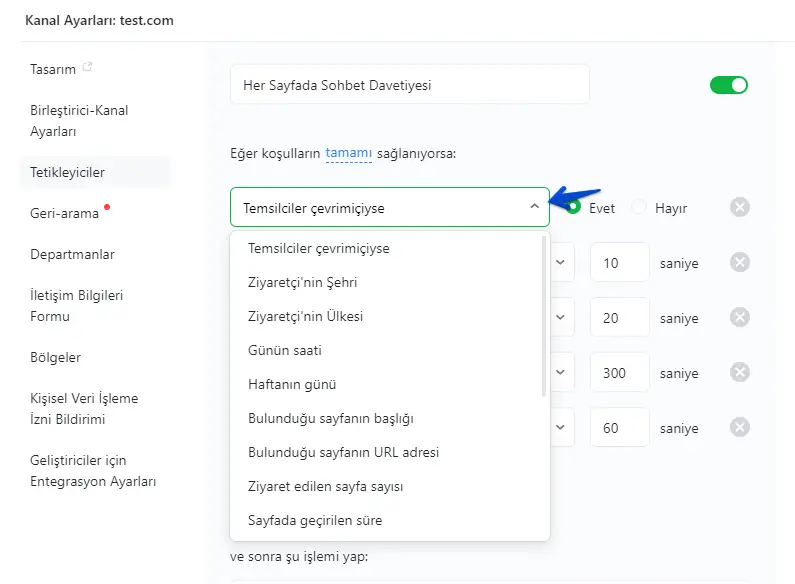 JivoChat, yönetici panelindeki "Tetikleyiciler" ayarlarıyla akıllı davetiyeler göndermek için çok çeşitli seçenekler sunar: