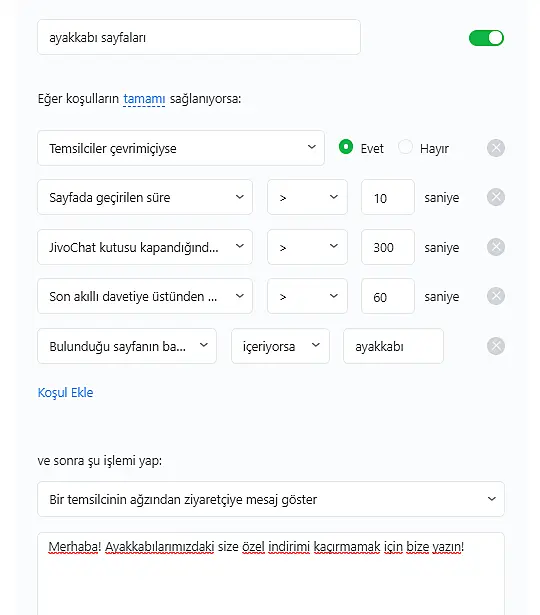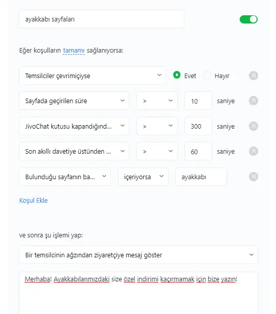 Örneğin, sayfa başlığı "ayakkabı" kelimesini içeriyorsa, ilgili tetikleyici devreye girecekir. Sonuç olarak, ziyaretçinin hedef sayfasında olması halinde, o zaman bu sayfa için özel olarak bir davetiye tetiklenecektir. Buna ek olarak "Her sayfada sohbet davetiyesi" tetikleyicisine, özelleştirdiğiniz sayfada çalışmaması için bir koşul eklemelisiniz. İlgili tetikleyiciye bulunduğu sayfanın başlığı içermiyorsa "ayakkabı"şeklinde bir koşul eklemelisiniz. Bu sayede "ayakkabı" sayfalarında ayakkabılar ile ilgili davet metni, diğer sayfalarda "Merhaba! Size nasıl yardımcı olabilirim?" mesajı gözükecektir.