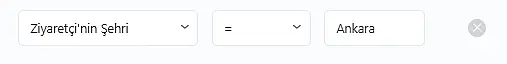 Olası koşullardan biri, ziyaretçinin şehridir. Ziyaretçinin şehrini belirleme fırsatını kullanarak, ziyaretçinize bölgenin en yeni bilgilerini\konumunu bildirebilirsiniz. Örneğin: "Bugün ve yarın, 100 liralık siparişler için Ankara'ya özel bir teklif - ücretsiz nakliye var. Herhangi bir sorunuz varsa lütfen bize ulaşın." gibi özel bir davet metni için tetikleyici ayarlarında "Ziyaretçinin Şehri" koşulunu seçmeli ve şehir adının ilk harflerini girmelisiniz: