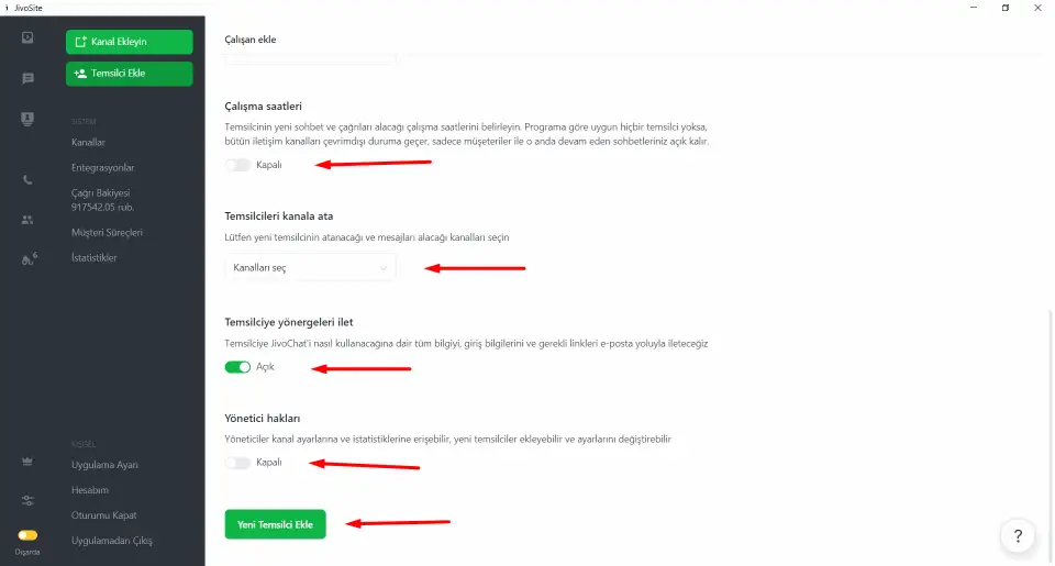 Ayrıca temsilciyi hangi kanallara atayacağınızı ve kuruluma dair yönergeleri e-posta ile iletmek isteyip istemediğinizi seçebilirsiniz.