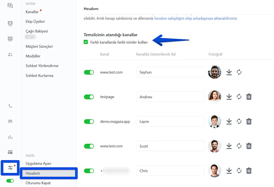 Uygulamaya giriş yaparak başlayın, "Yönet" -> "Hesabım" adımlarını izleyin -> "Temsilcinin atandığı kanallar" bölümüne gidin -> Özelliği etkinleştirmek için "Farklı kanallarda farklı isimler kullan" seçeneğini işaretleyin