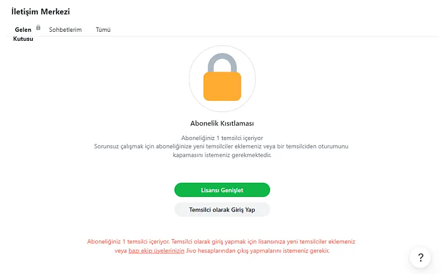 Temsilci olarak sınırsız sayıda ekip üyesi atanabilir, ancak bunlardan kaçının müşteri talepleriyle aynı anda çalışabileceğini lisansınız belirler. Uygulamada mevcut lisansınız kadar temsilci zaten oturum açmışsa, sonra giriş yapan temsilciler Gelen Kutusu bölümüne erişemez ve bölüme girdiklerinde aşağıdaki gibi bir uyarı görürler: