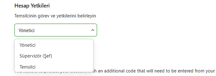 Ekip üyesinin profilinde aşağıda, çalışanın rolünü belirleyebileceğiniz "Hesap Yetkileri" açılır menüsünü bulacaksınız: