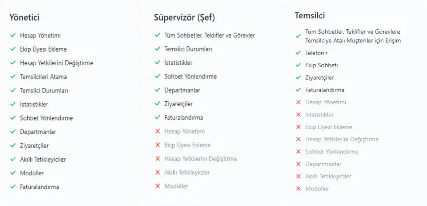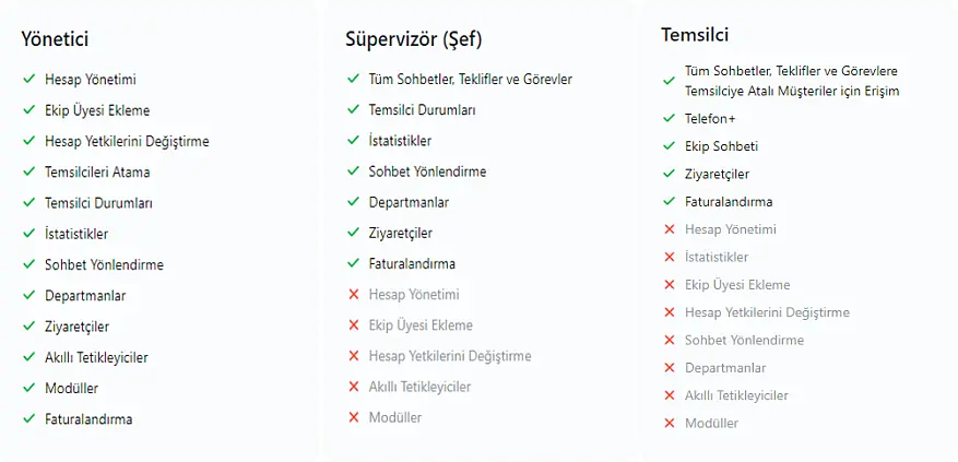 - Yönetici: hesap verilerine (ayarlar, istatistikler, müşteri listesi ve sohbet geçmişi vb.) en eksiksiz erişime sahip olan çalışandır.