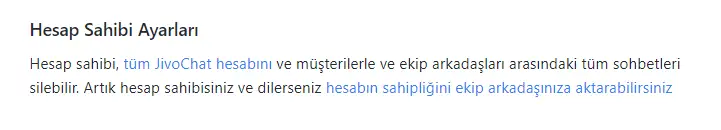 Varsayılan olarak hesap sahibi, JivoChat'ya ilk olarak kayıt olan kullanıcıdır. Hesap sahibine özel olarak tanımlanmış bazı haklar bulunur: Bu hesap diğer hesap yöneticileri tarafından silinemez ve hesap ayarları diğer kullanıcılar tarafından değiştirilemez.